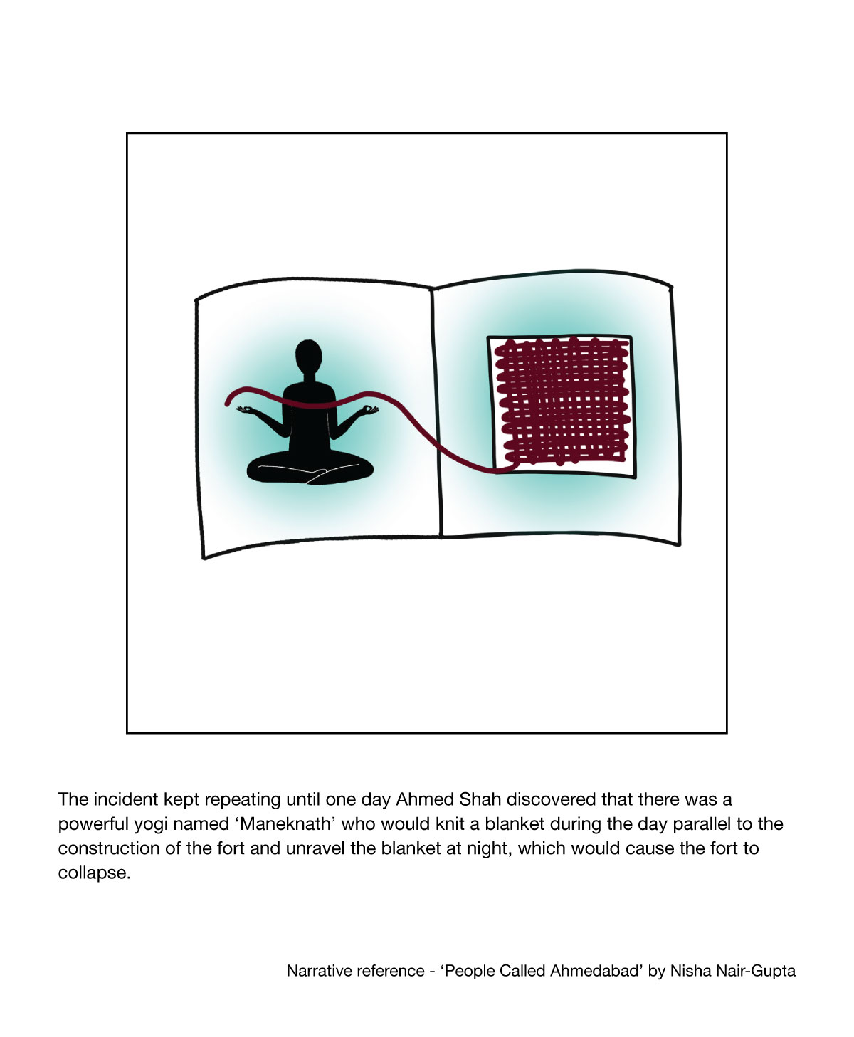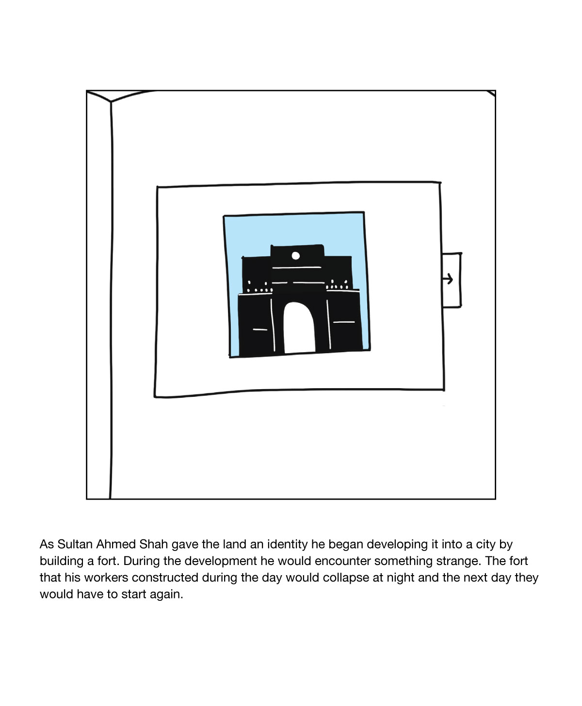 The objective of this prototype was to test whether the visuals were clear enough to communicate the activities depicted. For example, on the first page, the activity is: ”a building standing still during the day, then breaking at night.” Its narrative, which provides additional context, is included in a separate narrative booklet. The accompanying narrative was: “As Sultan Ahmed Shah gave the land an identity, he began developing it into a city by building a fort. However, during this development, he encountered something peculiar—the fort that his workers constructed during the day would collapse at night, forcing them to restart the following day.”